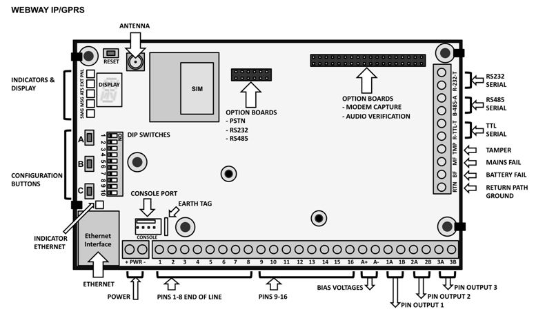 Located in the bottom right of the board they are paired, volt-free contacts = 1A+1B, 2A+2B, 3A+3B To control each output individually from Command Centre use the Site -> Control Status -> Relay Control Box: Please note we are working on adding this controls to Connections in WebWay World. To learn more about this please show your interest by giving us feedback using the Ask WebWay form.