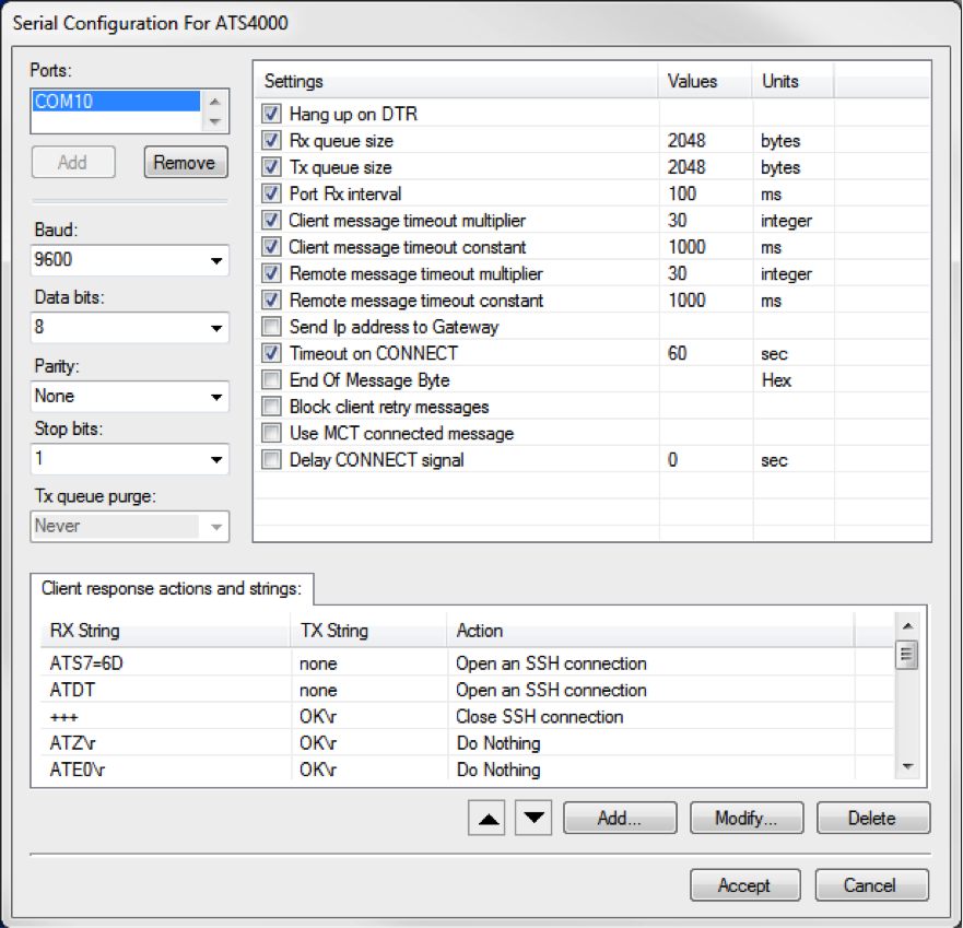 You may need to change the COM port to one of the virtual serial ports you created and selected for the RM to listen on. COM10 is the default port for all sessions using the serial interfaces.