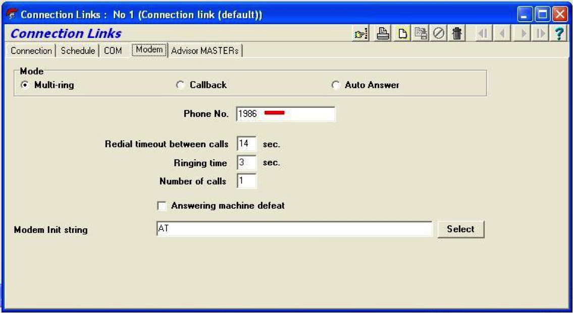 5) Finally the Modem tab needs configuring with these settings (note – the only thing to change from site to site will be the phone number which relates to the site ID):